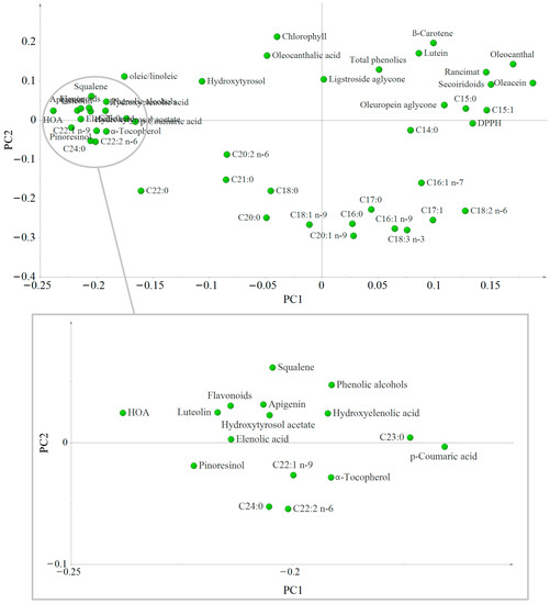 To interpret the distribution seen in the score plot, the loading plot was performed (Figure 4). The variables located far from the plot origin correlate to the samples positioned in the same part of the scatter plot (Figure 2). Thus, the variables most associated with O1 samples are the majority of the phenolic compounds (except the secoiridoids), α-tocopherol, squalene, the oleic/linoleic ratio, and the very-long-chain Fas (C22:0, C22:1 n-9, C22:2 n-6, C23:0, and C24:0), and that the samples produced the day after harvesting (right side of the plot) had a higher content of the other Fas and secoiridoids. O2 samples are associated with the same variables as O1, but to a lesser extent, because the separation between samples and variables is greater in this case. Additionally, the loading plot gives information about the relationships among the variables. The proximity of Rancimat values to secoiridoids, particularly oleacein and oleocanthal, corroborates the strong positive correlation between these variables. DPPH values and oleuropein aglycone are also situated quite closely to these variables, as are lutein and β-carotene, indicating a positive correlation. These positive correlations demonstrate the contribution of these compounds to the oil oxidative stability: the closer to Rancimat, the greater the contribution. Therefore, secoiridoids, especially oleacein and oleocanthal, are the major contributors. Benito et al. [41] also found a very good correlation between oleacein and total secoiridoids and oxidative stability of ‘Arbequina’ EVOOs. In addition, a possible synergistic effect between secoiridoids and carotenoids could enhance the antioxidant activity, as also envisaged by previous studies [45,46]. All these variables are associated with O3 and O4 samples, as their position in the loading and scatter plot match (upper right side).