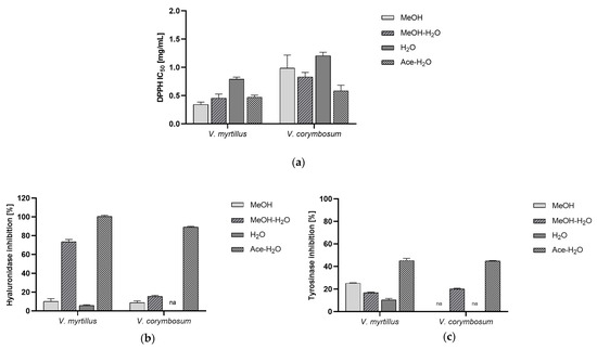 The biological activity of Vaccinium myrtillus and Vaccinium corymbosum extracts; the antioxidant potential (a), the anti-hyaluronidase potential (b), the anti-tyrosinase potential (c); na—not active.