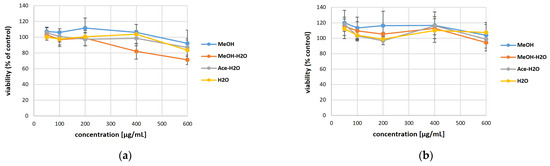 The evaluation of the effect of the studied extracts was performed using the MTT assay, as previously described [25]. Briefly, HaCaT immortalized keratinocytes (Cell Lines Service, Eppelheim, Germany) were grown in DMEM supplemented with 10% FBS and 1% antibiotics solution. Cells were seeded into 96-well plates, and after 24 h pre-incubation, fresh medium containing the increasing concentrations of the studied extracts was added into wells, and cells were incubated for a subsequent 72 h. Next, wells were rinsed with warm PBS buffer, and fresh medium supplemented with 0.5% MTT salt was added into wells. Absorbance (570 nm, Infinite M200 plate reader, Tecan, Austria) was measured after 4 h incubation followed by dissolving formazan crystals using acidic isopropanol. Experiments were repeated four times with at least four technical replicates per assay. Impact on viability was calculated as percentage of results obtained for cells treated with the appropriate vehicle only.