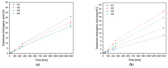 Release profiles of chlorogenic acid expressed in % (a) and expressed in mg/cm2 (b) for hydrogels H1–H4.