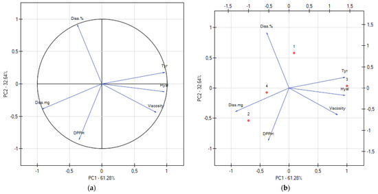 The relationship of hydrogels properties on the factorial plane formed by the first two principal components (a), and principal component analysis (PCA) showing the factor loading plot (b).