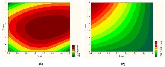 Using experimental data and statistical analysis, it was possible to estimate the model and determine the hydrogel’s optimal composition (Figure 5). To get optimal hydrogel characteristics, 1% extract and 2.5% MMW chitosan were utilized.