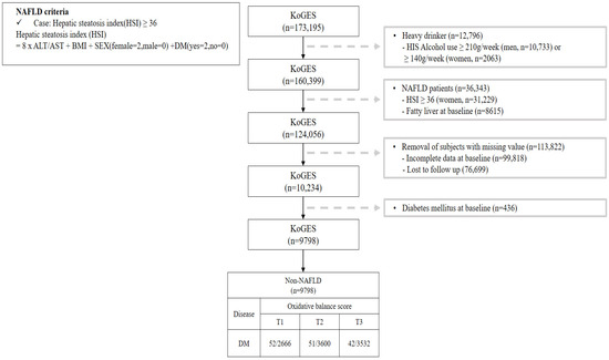 This study investigated the OBS of patients without NAFLD and Figure 1 shows a flow chart describing this study. We excluded participants (n = 36,343) with a value for the hepatic steatosis index (HSI) [17] of over 36 among 173,195 participants. Additionally, participants with heavy alcohol use (≥210 g/week in men; 140 g/week in women) [18] (n = 12,796), lost to follow-up (n = 76,699), with missing covariates (n = 99,818), and with pre-existing diabetes (n = 436) were all excluded. After those exclusions, a total of 9798 participants without NAFLD were included with their disease history and mortality records.