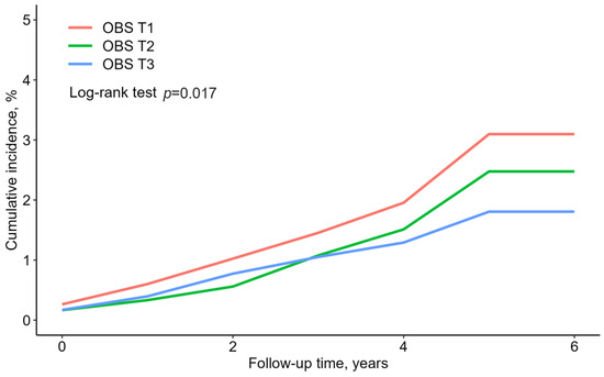 Figure 2 presents the rate of cumulative new-onset T2DM according to the OBS tertiles, presented as Kaplan–Meier curves. The T3 group showed the significantly lowest cumulative incident T2DM, followed by the T2 and T1 groups (log-rank test, p = 0.017).