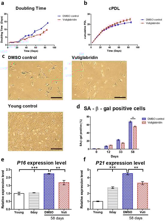 Compared to the Young control, HDFs cultured with DMSO for 58 days showed P16 and P21 expression levels of 2.24 and 4.52-fold, respectively (Figure 1e, p < 0.001). In contrast, HDFs cultured with vutiglabridin for the same period showed P16 and P21 gene expression levels of 1.69- and 3.31-fold, respectively (Figure 1e, p < 0.001, p < 0.01), which were significantly lower than that of the DMSO group.