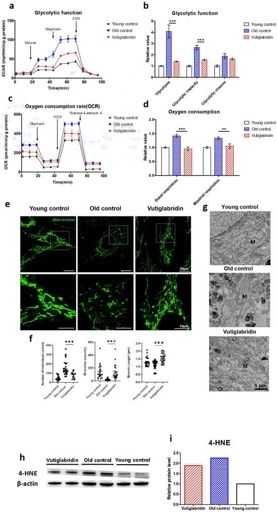Mitochondrial dysfunction was reduced in the Vutiglabridin group. Vutiglabridin mitigates mitochondrial dysfunction and oxidative stress of aging HDFs. (a) A representative graph output from the XFe24 analyzer showing the ECAR response to glucose, oligomycin, and 2-deoxyglucose (2-DG). The glycolytic activities were assessed by measuring the ECAR with the Seahorse XFe24 analyzer. HDFs treated with 20 μM of vutiglabridin (Vutiglabridin) or an analog volume of vehicle (Old control) for 58 days from passage 32. HDFs in passage 14 were used as a young control (Young control). The ECAR values (mpH/min) were normalized to μg of protein. Each data point represents means ± SEM (n = 5). (b) Glycolytic activities: glycolysis, glycolytic capacity, and the glycolytic reserve of Old control, Vutiglabridin, and Young control. As described, relative values are generated in Figure 2a []. The glycolysis rate was calculated as the difference between the ECAR level before and after injecting glucose. Glycolytic capacity was calculated as the difference between the ECAR level before injecting glucose and after ejecting oligomycin. The glycolytic reserve was calculated as the difference between the ECAR level before and after ejecting oligomycin. Each data point represents means ± SEM (n = 5; *** p < 0.001 by student’s two-tailed t-test). (c) A representative graph output from the XFe24 analyzer showing the OCR response to oligomycin, fluoro-carbonyl cyanide phenylhydrazone (FCCP), and rotenone/antimycin A. HDFs treated with 20 μM of vutiglabridin (Vutiglabridin) or an analog volume of vehicle (Old control) for 58 days from passage 32. HDFs in passage 14 were used as a young control (Young control). All OCR values (pmol/min) were normalized to μg of protein. Each data point represents means ± SEM (n = 5). (d) Plots of basal respiration and maximal respiration of Old control, Vutiglabridin, and Young control. Data extracted from the analyses in Figure 2c. Relative values were generated from Figure 2c in accordance with Divakaruni et al. []. Basal respiration was calculated as the difference between the OCR level before injecting oligomycin and after injecting rotenone/antimycin A. Maximal respiration was calculated as the difference between the OCR level before and after injecting rotenone/antimycin A. Every value in Young control is normalized to 1. Each data point represents means ± SEM (n = 5; ** p < 0.01, *** p < 0.001 by student’s two-tailed t-test). (e) Morphological changes of mitochondria in light microscopy. Confocal imaging of cells treated with 200 nM Mitotracker showed mitochondrial structures. The scale bar is 20 µm. (f) The bars represent median values, and each black dot represents different data points (n = 20–30; *** p < 0.001 by student’s two-tailed t-test). (g) The ultrastructure of mitochondria in electron microscopy. M: mitochondria. The scale bar is 1 µm. (h) Total lysates from 20 μM of vutiglabridin or the same volume of DMSO-treated 58-day HDFs were subjected to western blotting using specific antibodies for 4-HNE and β-actin. (i) Mean value graphs for quantification of Figure 2h.