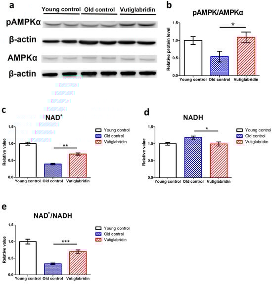 Vutiglabridin restoring the expression of the metabolic regulatory proteins in aging HDFs was changed in the Vutiglabridin group. (a) Total lysates from Young HDFs or 20 μM of vutiglabridin or the same volume of DMSO-treated 58-day HDFs were subjected to western blotting using specific antibodies for phosphorylated(p)-AMPKα, AMPKα, and β-actin. (b) pAMPKα/AMPKα ratios were quantified. Data are shown as means ± SEM (n = 4). (c–e) Concentrations of NAD+ (c), NADH (d), and the ratio of NAD+/NADH (e) were measured in HDF groups. Young control is passage 14 HDF groups. Old control is 58 days DMSO-treated HDF groups. Vutiglabridin is 58 days vutiglabridin-treated HDF groups. Values in the Young control were normalized to 1. Data are shown as means ± SEM (n = 3, * p < 0.05, ** p < 0.01, *** p < 0.001 by student’s two-tailed t-test).