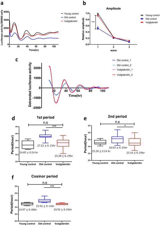 Also, the circadian clock period of the Vutiglabridin group, as measured by first period, second period, and cosinor period, did not show a significant difference compared to the Young control group, suggesting strong normalization of circadian rhythmicity induced by vutiglabridin (Figure 4b–d): 24.85 ± 0.24 h Young control group vs. 25.38 ± 0.29 h Vutiglabridin group; 25.20 ± 0.14 h Young control group vs. 25.16 ± 0.29 h Vutiglabridin group; 24.97 ± 0.08 h Young control group vs. 24.92 ± 0.04 h Vutiglabridin group.
