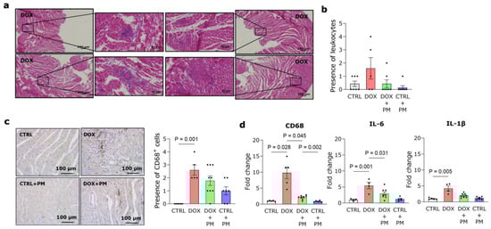 DOX administration resulted in an increase in CD68+ cells, a marker of monocytes and macrophages, in LV tissue (Figure 2a–c). This finding was confirmed by increased CD68 gene expression in DOX-treated animals (Figure 2d, left panel). The expression was significantly lower in the DOX+PM group. DOX also induced a higher gene expression of the pro-inflammatory cytokines IL-6 and IL-1β, which was reduced with PM (Figure 2d, middle and right panels). Different macrophage subsets were also evaluated. After eight weeks of DOX administration, no difference was observed in the gene expression of CD86, a marker of antigen-presenting cells, compared to CTRL (Figure S3a), while the gene expression of the anti-inflammatory macrophage marker CD163 was significantly increased with DOX and lowered by PM (Figure S3b, left panel). The gene expression of CD206 remained similar in all groups (Figure S3b, right panel).