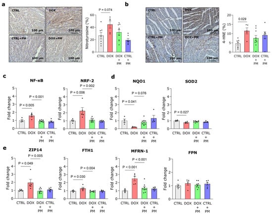 DOX administration increased nitrotyrosine deposition in LV tissue (Figure 3a). In addition, quantification of 4-HNE protein levels revealed that lipid peroxidation was significantly increased in DOX-treated animals compared to CTRL, which could not be alleviated by PM (Figure 3b). The gene expression of pro-oxidative and antioxidative transcription factors, respectively, NF-κB and NRF-2, was significantly increased by DOX, while PM could restore these levels (Figure 3c). The gene expression of the antioxidative genes NQO1 and SOD2 was significantly lower in the DOX-treated animals compared to CTRL (Figure 3d). PM treatment increased NQO1 gene expression but did not affect SOD2 gene expression. DOX alone did not alter the expression of the gene TOP2β. However, the administration of PM significantly lowered TOP2β expression (Figure S4a). To further unravel the underlying mechanisms responsible for the protective nature of PM, we examined the expression of genes involved in cellular iron regulation. These data revealed that DOX administration significantly increased the gene expression of the cytosolic iron importer ZIP14, iron storage gene FTH1, and mitochondrial iron importer MFRN-1, while the expression of the cytosolic iron exporter FPN was unchanged (Figure 3e). Concomitant PM treatment significantly lowered the gene expression of ZIP14, FTH1, and MFRN-1. The expression of other genes involved in iron metabolism was unchanged with DOX (Figure S4b,c, left panel, and d), except for NRAMP2, responsible for the transport of iron from endosomes to the cytosol, which was significantly reduced after PM treatment (Figure S4c, right panel).
