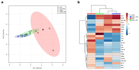 The gene expression analysis of 24 genes involved in inflammation, oxidative stress, apoptosis, and fibrosis revealed a highly distinguished profile between the DOX and CTRL groups, suggesting that DOX induces profound changes in gene expression (Figure 5a,b). The redox regulation was disturbed in the DOX-treated group, as shown by the downregulation or upregulation of (anti)oxidative stress-related genes (HO-1, NOX2, NOX4, NQO1, NRF-2, SOD1, and CAT), whereas PM restored the expression towards the CTRL profile. In addition, PM downregulated the relative gene expression of apoptosis-related genes (p53, BAX, and Bcl-2), inflammatory-associated genes (NF-κB and IL-6), and fibrosis genes (LOX, type I collagen, and type III collagen) compared with the DOX-treated group. Overall, DOX treatment shifted the gene expression profile of many genes related to inflammation, apoptosis, fibrosis, and oxidative stress, whereas PM partially prevented this shift and moved toward the CTRL profile.