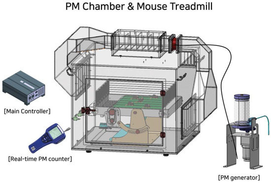 A schematic diagram of the particulate matter (PM) chamber used in this study. The PM generator introduces fine dust into the chamber, the concentration of which is continuously monitored in real-time using an AeroTrak Handheld Particle Counter 9303 (TSI, Shoreview, MN, USA). The PM chamber and its main controller include a mouse treadmill with adjustable speed and duration.