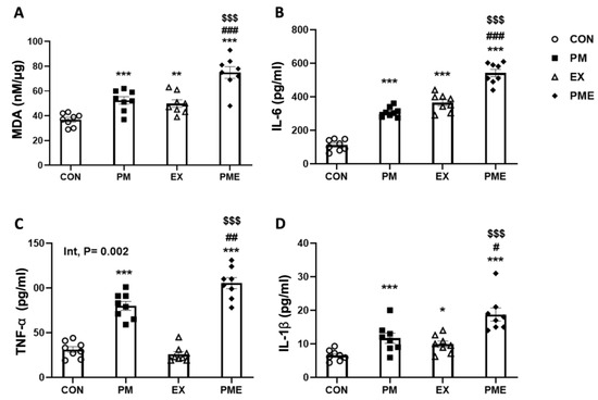 Inflammatory response levels in the gastrocnemius muscle of C57BL/6 mice exposed to particulate matter during exercise. (A) MDA (malondialdehyde), (B) IL-6, (C) TNFα, and (D) IL-1β. Control (CON, n = 8), particulate matter exposure (PM, n = 8), exercise (EX, n = 8), and particulate matter exposure + exercise (PME, n = 8). Data are expressed as the means ± SEM. Statistical significance is assigned as * p < 0.05, ** p < 0.01, *** p < 0.001 vs. CON, # p < 0.05, ## p < 0.01, ### p < 0.001 vs. PM and $$$ p < 0.001 vs. EX. Two-way ANOVA results were shown with p values. Int, interaction.