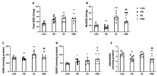 Redox status in the gastrocnemius skeletal muscle of C57BL/6 mice exposed to particulate matter during exercise. (A) Total superoxide dismutase (SOD), (B) manganese superoxide dismutase (MnSOD), (C) total glutathione (tGSH), (D) glutathione disulfide (oxidized glutathione, GSSG), and (E) GSH/GSSG ratio. Control (CON, n = 8), particulate matter exposure (PM, n = 8), exercise (EX, n = 8), and particulate matter exposure + exercise (PME, n = 8). Data are expressed as the means ± SEM. Statistical significance is defined as * p < 0.05, ** p < 0.01, *** p < 0.001 vs. CON, # p < 0.05, ### p < 0.001 vs. PM and $ p < 0.05, $$ p < 0.01 vs. EX.