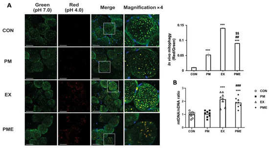 In vivo mitophagy levels in the skeletal muscles of mt-Keima mice were modified by particulate matter exposure and exercise. (A) Representative confocal images showing superimposed red/green signals in the skeletal muscle of mt-Keima mouse. The yellow signal Indicates merged red and green fluorescence. The white square indicates area shown magnified in each inset (4x magnification). Control (CON, n = 4), particulate matter exposure (PM, n = 4), exercise (EX, n = 4), and particulate matter exposure + exercise (PME, n = 4). (B) Level of mitochondrial biogenesis (mtDNA to nDNA ratio). Control (CON, n = 8), particulate matter exposure (PM, n = 8), exercise (EX, n = 8), and particulate matter exposure + exercise (PME, n = 8). Data are presented as the mean ± SEM. Statistical significance is assigned as *** p < 0.001 vs. CON, ## p < 0.01 and ### p < 0.001 vs. PM, and $$ p < 0.01 vs. EX. Scale bar, 50 μm.