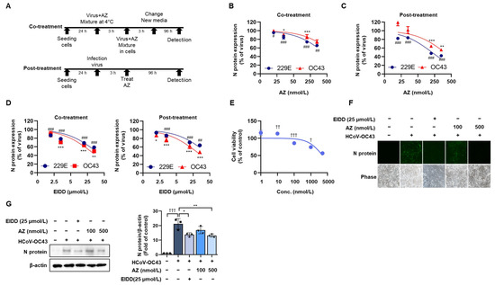 MRC-5 cells were cultured in 24-well plates at a density of 1 × 105 cells/well for 18 h. For the co-infection assay, various concentrations of AZ and HCoV-OC43 (MOI = 0.1) or HCoV-229E (MOI = 2), were mixed and incubated at 4 °C for 3 h, respectively. After incubation, the cells were exposed to the mixture at 4 °C for 3 h, washed, and added to complete media. For the post-treatment assay, the cells were exposed to HCoV-OC43 and HCoV-229E for 3 h, washed, and treated with various concentrations of AZ for 24 h. After incubation, N protein staining was performed according to Section 2.4.