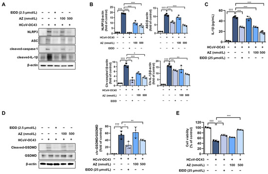 The NLRP3 inflammasome is activated following viral infection [18]. The components of the NLRP3 inflammasome include NLRP3, ASC, and caspase-1. These complexes assemble in response to diverse stimuli, resulting in the activation of caspase-1. Activated caspase-1 converts pro-IL-1β to IL-1β to induce a proinflammatory response [33]. Therefore, we determined the effect of AZ on preventing the activation of the NLRP3 inflammasome in HCoV-OC43-infected MRC-5 cells. As shown in Figure 3A–C, AZ inhibited the increased expression of the NLRP3 inflammasome components, NLRP3, ASC, and cleaved caspase-1, and reduced both the secretion of IL-1β and the expression of cleaved IL-1β following HCoV-OC43 infection. The results indicate that AZ decreased the expression of the NLRP3 inflammasome in HCoV-OC43-infected MRC-5 cells. Pyroptosis is activated downstream of inflammasome activation. The activation of caspase-1 can cleave the pore-forming protein gasdermin D (GSDMD), freeing its N-terminus, which targets the cell membrane to assemble pore structures and induce pyroptosis, a form of inflammatory cell death. In addition, the expression of the cleaved GSDMD, a marker of pyroptosis, was measured via Western blot analysis. The results indicated that the expression of cleaved GSDMD increased by HCoV-OC43 infection decreased after the AZ treatment (Figure 3D) [34,35,36]. We determined the effect of AZ on reducing cell viability following HCoV-OC43 infection. AZ treatment increased the cell survival rate, which was reduced by viral infection (Figure 3E). The results suggest that AZ inhibits HCoV-OC43-induced pyroptosis to maintain cell viability.