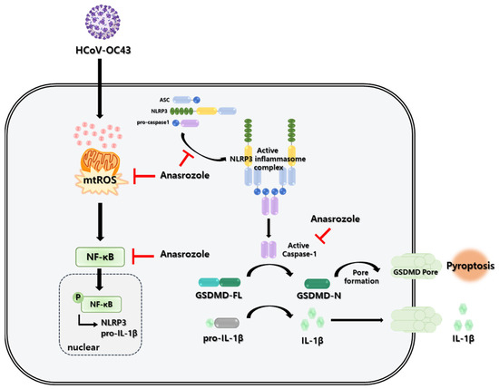 Viral infections affect the production and release of reactive oxygen species within the mitochondria (mtROS), resulting in mitochondrial dysfunction [7,8,9,10,11,12,13,14,15]. Although ROS are chemically reactive molecules that play important roles in cell signaling and homeostasis, excessive ROS results in oxidative stress and promotes an inflammatory response and cell death [16,17]. In particular, ROS activates nuclear factor kappa B (NF-κB), which translocates to the nucleus to regulate the expression of various genes, including proinflammatory factors in response to oxidative stress conditions. Virus-induced mtROS can cause an excessive immune response through the formation of the nod-like receptor protein 3 (NLRP3) inflammasome, which is an intracellular sensor comprising NLRP3, apoptosis-associated speck-like protein containing a CARD (ASC), and precursor caspase-1 (CASP1), which can detect a wide range of stimuli, ultimately resulting in cellular damage [18,19]. Caspase-1 activation, following further processing by precursor caspase-1, cleaves prointerleukin-1β (pro-IL-1β), pro-IL-18, and gasdermin D (GSDMD), consequently forming transmembrane pores with the N-terminus of the GSDMD (GSDMD-N) and facilitating the release of proinflammatory cytokines, such as IL-1β and IL-18, and the dysregulation of intracellular and extracellular ion gradients, exacerbating inflammation and ultimately triggering pyroptosis following viral infection [20,21]. Thus, compounds targeting ROS and the ROS-mediated inflammatory response represent potential antiviral agents.