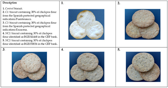 Figure 1 displays the external appearance of the formulated biscuits, with a detailed description of the specific chickpea ecotypes utilized in the recipe. The color of biscuits has a significant impact on their acceptance by consumers; hence, it is important to determine how recipe alteration affects biscuits appearance.