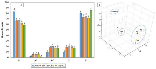 CIElab color of formulated biscuits (A) and 3D representation (B). h* is expressed in degrees. Data are expressed as mean values ± SD. Different letters within each parameter indicate significant differences between biscuits (p < 0.05).