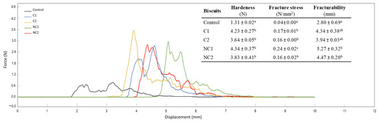 Three-point bending test curves and parameters selected to evaluate texture in formulated biscuits. Data are expressed as mean values ± SD. Different letters within each column indicate significant differences between biscuits (p < 0.05).