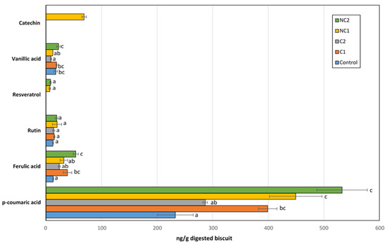 Major phenolic compounds detected in the bioaccessible fraction after IVGD of formulated biscuits. Data are expressed as mean values ± SD. Different letters within each compound indicate significant differences between biscuits (p < 0.05).