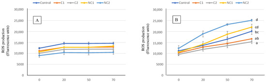 The antioxidant activity of the digested samples was also assessed at the cell level by measuring the effect in ROS production of Caco-2 cells (Figure 6). At basal or physiological conditions, there is always a slight production of ROS by cells, a consequence of their normal metabolism being able to properly trigger defense metabolic pathways [48]. In such situations (part A), preincubating the cells for 2 h with the BF of the biscuits induced modest ROS generation, with no differences found among the different biscuits. When an oxidative injury was induced, the ROS production was strongly stimulated, resulting in stressed cells (part B). Then, differences in the ROS final level were observed after exposure to digested biscuits, thus indicating diverse capacities to prevent the free radical overproduction. In this case, the prevention effect was more pronounced with samples containing commercial chickpea flour, whereas the conventional biscuit (Control) showed intermedium ROS induced levels between C and NC chickpea samples.