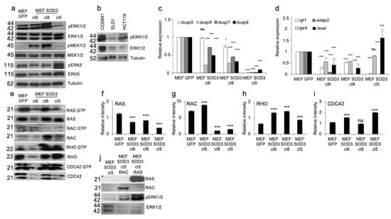 Characterization of ERK1/2 expression in vitro models. (a) Western blot analysis of MEF GFP, MEF SOD3 cl6, MEF SOD3 cl8, and MEF SOD3 cl5. Our analysis demonstrated moderately increased ERK1/2 phosphorylation in cl8 and markedly decreased phosphorylation in cl5. MEK1/2 staining supported the ERK1/2 activation results. The phosphorylation of ERK5 was moderately increased in MEF SOD3 cl5 cells. (b) Western blot analysis for ERK1/2 phosphorylation in CCD841, DLD1, and HCT116 cells. Both the phosphorylation and total ERK1/2 levels are lower in DLD1 and HCT116 adenocarcinoma cells as compared to CCD841 normal colon epithelial cells. (c) The mRNA expression analysis for dusp5, 6, 7, and 9 showed significantly decreased expression in all MEF SOD3 clones. (d) The mRNA expression analysis for small GTPase regulatory gene expression showed decreased rgl1, rgs4, adap2, and rasal mRNA levels in MEF SOD3 cl6 and cl8. The MEF SOD3 cl5 adap2 expression was at the same level as in MEF GFP controls, while the rasal expression was significantly increased. (e) Pull down assay for RAS, RAC, CDC42, and RHO in MEF GFP, MEF SOD3 cl6, MEF SOD3 cl8, and MEF SOD3 cl5. (f–i) Intensity measurement of small GTPase pulldown assay. (j) RAS, RAC, and ERK1/2 Western blot in MEF SOD3 cl5 cell overexpressing ras or rac. p-values are * p < 0.05, and *** p < 0.001. p-value was determined using GFP-expressing cells as a comparison control. ns. refers to non-significant.