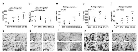 Chemotactic invasion through Matrigel. Characterization of the effect of ERK1/2 overexpression on migration in vitro in CCD841 (a,b), CCD841 RNAi (c,d), DLD1 (e,f), HCT116 (g,h), and MEF SOD3 cells (i,j). According to the results, ERK2 overexpression resulted in a higher invasion rate as compared to ERK1 overexpression. RNAi significantly reduced the invasion potential of ERK2 and ERK1/2 cells below GFP control cells. p-values are ** p < 0.01, and *** p < 0.001. The p-value was determined using GFP-expressing cells as a comparison control. Magnification of the cells is 20×.