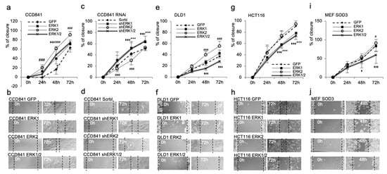 It is noteworthy that the combined expression of ERK1 and ERK2 in DLD1, HCT116, and MEF SOD3 cells significantly (p < 0.001) reduced cellular movement as compared to GFP-transduced controls (Figure 4i,j).