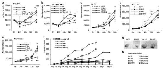 Characterization of the effect of ERK1/2 overexpression on cell proliferation in vitro and in vivo in CCD841, CCD841 RNAi, DLD1, HCT116, and MEF SOD3 cells. (a–e) ERK2 overexpression significantly increased cell proliferation in all cell models studied, whereas ERK1 overexpression had an obsolete effect. Simultaneous ERK1/2 expression promoted cell proliferation in CCD841 cells, whereas it inhibited growth in DLD1 and MEF SOD3 cells. Similar to collective migration, RNAi significantly reduced cell proliferation of shERK2 cells and increased shERK1/2 cells. (f) In vivo tumorigenesis of HCT116 cells overexpressing GFP, ERK1, ERK2, or ERK1/2 in nude mice. ERK2 overexpressing cells demonstrated the highest tumor formation capacity corroborating in vitro data. (g,h) Tumor size and tumor initiation capacity further strengthened the obtained results suggesting moderately reduced tumor sizes in ERK1 overexpressing cells and highest tumor sizes in ERK2 expressing cells. The tumor formation capacity data showed two tumors out of six transplantations for GFP control cells, three tumors out of six transplantations for ERK1 cells, four tumors out of six transplantations for ERK2 cells, and two tumors out of six transplantations for ERK1/2 cells. p-values are */♦ p < 0.05, **/##/♦♦ p < 0.01, and ***/###/♦♦♦ p < 0.001. The p-value was determined using GFP expressing cells as a comparison control. (*/**/*** refers to ERK1, ##/### refers to ERK2, ♦/♦♦/♦♦♦ refers to ERK1/2).