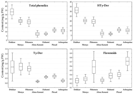 In order to evaluate the consistency of their respective phenotypic characters in relation to the phenolic content, these seven cultivars of the WOGB core collection were assessed across different crop seasons (Figure 1). For this purpose, the trees were grown under the same agronomic (i.e., fertilization and irrigation) and edapho-climatic conditions and the fruits were carefully hand-picked at the same ripening stage (turning, R-II) in at least eight different crop years in the period 2008–2022, so that the content of phenolics would only be affected by its crop year. Figure 1 does not contain data on the three genotypes of the cross ‘Picual’ × ‘Arbequina’ (‘UCI-20’, ‘UCI-21’, and ‘UCI-42’) since the study did not cover a long enough period of years. HTy-Der are by far the main contributors to the total content of phenolic compounds in the fruit, followed by the Ty-Der and finally the flavonoids, although in the case of the Arbequina cultivar, the content of flavonoids exceeds that of Ty-Der, constituting a good identification marker of the cultivar. In all cases, it was also found that the phenotype of each cultivar is generally maintained over the different years, clearly marking differences between the selected cultivars, with the exceptions of the Ty-Der content for the high phenolic content cultivars (‘Dokkar’, ‘Menya’ and ‘Piñonera’) and that of flavonoids for cultivars ‘Piñonera’ and ‘Arbequina’, which shows a high variability across the years. Thus, the cultivar ‘Dokkar’ showed to be representative of cultivars high in phenolics (>30 mg/g FW), ‘Menya’ and ‘Piñonera’ of the medium content cultivars (20–25 mg/g FW), and ‘Abou kanani’ and ‘Fishomi’ are representatives of cultivars low in phenolics (<10 mg/g FW). As shown, cultivars ‘Picual’ and ‘Arbequina’ might be considered almost as cultivars low in phenolics.