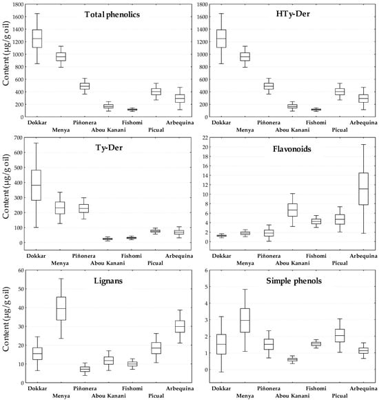 Variability across years for the content (µg/g oil) of the main groups of phenolic compounds in the oils from selected cultivars from WOGC. Horizontal inner lines in the boxes are mean values. The height in a box is equal to the standard error and the whiskers are the 0.95 confidence interval. Olive fruits at turning stage (R-II, MI~2,5) were hand-picked over the crop years 2008–2022 and processed for oil extraction in the same conditions, and each sample was extracted and analyzed twice for phenolics composition.