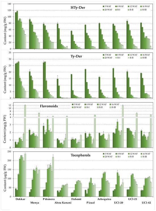 As shown previously in the snapshot of the content of phenolic compounds in ripe fruits in different years (Figure 1), the phenotype differences between cultivars seem to be maintained throughout the entire process of development and ripening of the fruit, from 3 weeks after flowering (3 WAF) to fully ripe fruits (R-III). Thus, ‘Dokkar’ fruits have the highest content of HTy-Der and Ty-Der compounds on average, while the ‘Fishomi’ and ‘Abou kanani’ fruits show the lowest content among those studied. Apparently, the later the onset of the typical decrease in the content of these compounds occurs throughout the development of the fruit, the greater the probability that the fruit will reach the ripening phase with higher phenolic content and, consequently, with a greater possibility to give rise to oils with a higher phenolic content.