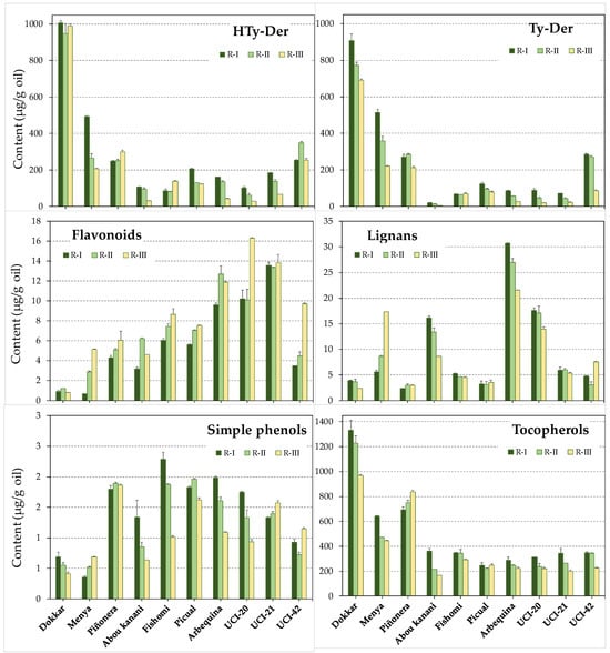 Similarly, the variability across different crop seasons of the phenolic content of the oils from the selected cultivars has been studied. As shown in Figure 2, the pattern coincides in general with that obtained for the content of fruit phenolic content (Figure 1), although a gap is now observed between the total phenolic content found for the cultivars ‘Menya’ and ‘Piñonera’ towards high and low phenolic content in the oils, respectively. As mentioned above, in addition to the content of phenolic glycosides in the olive fruit, the content of HTy-Der and Ty-Der in the oil is also related to the activity of the hydrolytic and oxidative enzymes acting during the oil extraction process that can substantially modify the final content of these compounds in the oil [,,]. As in the case of the fruit, HTy-Der are the main phenolics in the oil, followed by Ty-Der. Next, the content of flavonoids and lignans are found in approximately the same order of magnitude, while the simple phenols do not reach 0.3% of the phenolic compounds in the oil. Again, the data agree with those found in other studies [,]. It was also found in the oil that in all cases the character of each cultivar in terms of phenolic content is generally maintained throughout the years, clearly marking the differences between the selected cultivars. A notable variability across the years is only detected for the content of Ty-Der in the ‘Dokkar’ cultivar and of flavonoids in the ‘Arbequina’ cultivar, which reflects the variability found for these components in the fruits from which they come, albeit to a greater extent. Even so, they remain significantly differentiable from the rest of the cultivars in the content of these compounds.