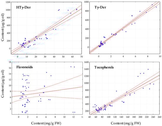 Comparison of the content of the main groups of phenolic compounds in the fruit and the oil samples from seven cultivars and three genotypes from the cross of cultivars ‘Picual’ × ’Arbequina’ along the fruit ripening phase. The regression line (solid red) and the 95% confidence interval for the regression line (dashed red lines) are represented.