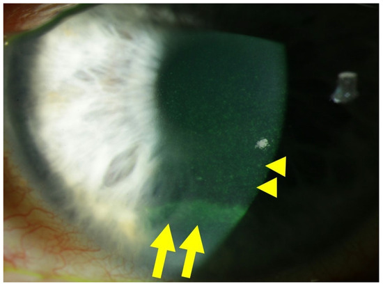 Slit lamp photograph of a patient with diabetic keratopathy, suffering from dry eye symptoms and recurrent corneal erosions. Fluorescein staining of the ocular surface reveals fine punctate keratitis (yellow dots), which is typical of dry eye disease (DED), highlighted by yellow arrowheads. In the inferior third of the cornea, an epithelial ridge (yellow horizontal line) is visible, indicative of a recently closed erosion, highlighted by yellow arrows.