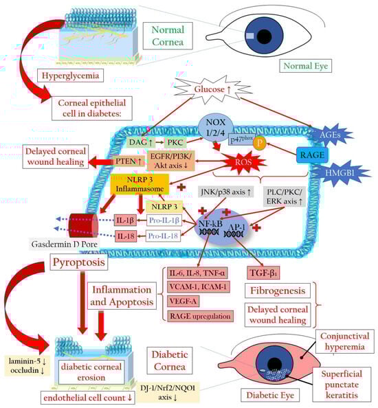 Cellular signaling mechanisms that lead to the demise of corneal epithelial cells in the context of diabetic keratopathy. AGEs: advanced glycation end products; Akt: Ak strain transforming (also known as protein kinase B); DAG: diacylglycerol; IL: interleukin; DJ-1: parkinsonism-associated deglycase 1; EGFR: epidermal growth factor receptor; ERK: extracellular signal-regulated kinase; HMGB1: high-mobility group box 1 protein; ICAM-1: intercellular adhesion molecule 1; NF-κB: nuclear factor kappa-light-chain-enhancer of activated B cells; NOX: NADPH oxidase or nicotinamide adenine dinucleotide phosphate oxidase; NQO1: NAD(P)H quinone oxidoreductase 1; Nrf2: nuclear factor erythroid-derived 2-related factor 2; P-p47phox: phosphorylated form of the protein p47phox, part of the NADPH oxidase enzyme system; PKC: protein kinase C; PI3K: phosphatidylinositol 3-kinase; PLC: phospholipase C; PTEN: phosphatase and tensin homologue protein; RAGE: receptor for advanced glycation end products; ROS: reactive oxygen species; TGF-β1: transforming growth factor beta 1; TNF-α: tumor necrosis factor alpha; VCAM-1: vascular cell adhesion molecule 1; VEGF-A: vascular endothelial growth factor A. Upward arrows indicate upregulation or increased activity, downward arrows indicate downregulation or decreased activity.