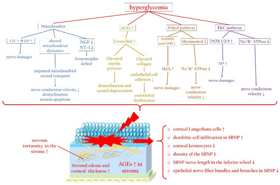 From a molecular standpoint, hyperglycemia triggers the activation of several pathways involving mitochondria, AGEs, the polyol pathway, and the PKC cascade. These pathways collectively contribute to an excess of ROS, ultimately leading to cell death and corneal nerve injuries [21,90].