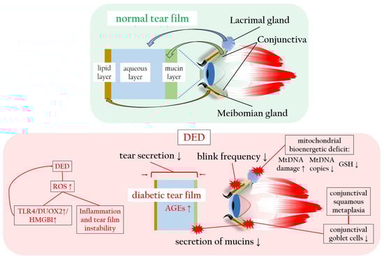 Normal and diabetic tear film in comparison, with particular focus on the ROS-related changes in tear film production, composition and stability. AGEs: advanced glycated end products; DED: dry eye disease; DUOX2: dual oxidase 2; GSH: glutathione; HMGB1: high-mobility group box 1 protein; mtDNA: mitochondrial DNA; RAGE: receptor of advanced glycated end products; ROS: reactive oxygen species; TLR4: toll-like receptor 4. Upward arrows indicate upregulation or increased activity, downward arrows indicate downregulation or decreased activity.