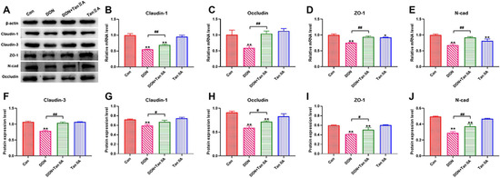 Effects of DON or/and Tan IIA exposure on barrier function in IPEC-J2 cells. (A) Western blotting bands of tight junction proteins. (B) Relative mRNA levels of Claudin-1. (C) Relative mRNA levels of Occludin. (D) Relative mRNA levels of ZO-1. (E) Relative mRNA levels of N-cad. (F) Relative protein levels of Claudin-3. (G) Relative protein levels of Claudin-1. (H) Relative protein levels of Occludin. (I) Relative protein levels of ZO-1. (J) Relative protein levels of N-cad. All data represent the mean ± SEM. * p < 0.05; ** p < 0.01 vs. Con group; # p < 0.05; ## p < 0.01 vs. DON group.