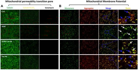 Effects of DON or/and Tan IIA exposure on mitochondrial function in IPEC-J2 cells. (A) Measurement of MPTP. (B) Measurement of MMP. The blue arrows indicate JC-1 aggregates; the white arrows indicate JC-1 monomers. Magnification: 100×.