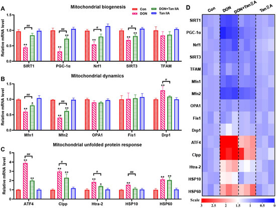 Effects of DON or/and Tan IIA exposure on mitochondrial quality control in IPEC-J2 cells. (A) Relative mRNA levels of mitochondrial biogenesis–related factors (SIRT1, PGC-1α, Nrf1, SIRT3and TFAM). (B) Relative mRNA levels of mitochondrial dynamics–related factors (Mfn1, Mfn2, OPA1, Drp1 and Fis1). (C) Relative mRNA levels of mitochondrial unfolded protein response–related factors (ATF4, Clpp, Htra-2, HSP10 and HSP60). (D) Heat map of relative mRNA levels of mitochondrial quality control–related genes. All data represent the mean ± SEM. * p < 0.05; ** p < 0.01 vs. Con group; # p < 0.05; ## p < 0.01 vs. DON group.