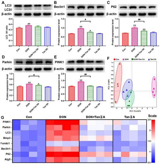 Effects of DON or/and Tan IIA exposure on mitophagy in IPEC-J2 cells. (A) Relative protein level of LC3. (B) Relative protein level of Beclin1. (C) Relative protein level of P62. (D) Relative protein level of Parkin. (E) Relative protein level of PINK1. (F) PCA score plot results comparing the mitophagy–related gene levels of four treatment groups. (G) Heat map of relative mRNA levels of mitophagy–related genes. All data represent the mean ± SEM. * p < 0.05; ** p < 0.01 vs. Con group; # p < 0.05; ## p < 0.01 vs. DON group.