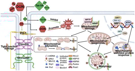 The mechanism diagram illustrating the alleviation of deoxynivalenol-induced intestinal toxicity by Tanshinone IIA through its stabilisation of the mitochondrial quality control system. DON disrupts tight junctions and generates excessive ROS in IPEC-J2 cells. Excessive ROS can damage mitochondria, including reduction of MMP and increased opening of MPTP. DON leads to a decrease in mitochondrial biogenesis and disrupts mitochondrial dynamics, including increased mitochondrial fusion and decreased mitochondrial fission, as well as an increase in mitochondrial unfolded protein response. However, Tan IIA can reverse various damages caused by DON.