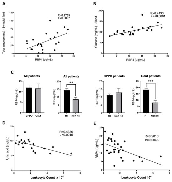 Correlations found in RBP4 levels tested through an ELISA assay used for the analysis of synovial fluid from 27 crystalline arthritis patients (14 patients with gout and 13 patients with CPPD). There is a positive correlation between patients’ synovial RBP4 concentrations and total glucose in the synovial fluid (A) and blood glucose levels (B). There was no significant difference in synovial RBP4 levels in gout and CPPD patients (p = 0.88). However, when separating our patients based on hypertension diagnosis, we observed that patients’ RBP4 levels are higher in hypertensive patients when both considering all patients together and gout patients alone, but this difference is absent in CPPD patients (C). Patients RBP4 levels correlated negatively with the synovial leukocyte count (D), which also correlated negatively with uric acid blood levels (E). RBP4 (retinol binding protein 4), CPPD (calcium pyrophosphate deposition). (p = statistical significance; ** p < 0.01; *** p < 0.001).