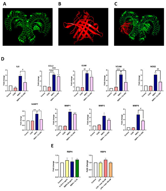 Visual representation of TLR4 structure in green (A), RBP4 in red (B), and the best result of the molecular docking (C). Cli95 pre-treatment partially inhibits the effect of RBP4, downregulating IL6, ICAM, VCAM, NOS2, NAMPT, and MMP9 (D). RBP4 expression is not modulated by IL1β, RBP4, or both stimuli together. The inflammatory stimulus LPS alone or in combination with a well-known COX1-2 inhibitor (indomethacin) in different doses cannot modulate RBP4 expression (E). TLR4 (Toll-like receptor 4), RBP4 (retinol binding protein 4), IL6 (interleukin 6), CCL2 (C-C motif chemokine ligand 2), ICAM (intercellular adhesion molecule 1), VCAM (vascular cell adhesion molecule), NOS2 (nitric oxide synthase 2), NAMPT (nicotinamide phosphoribosyltransferase), MMP1 (matrix metallopeptidase 1), MMP3 (matrix metallopeptidase 3), and MMP9 (matrix metallopeptidase 9), IL1β (Interleukin 1 Beta), Indo (indomethacin). (* p < 0.05; ** p < 0.01; *** p < 0.001; **** p < 0.0001 versus control condition. # p < 0.05; ## p < 0.01; #### p < 0.0001 between the conditions marked).