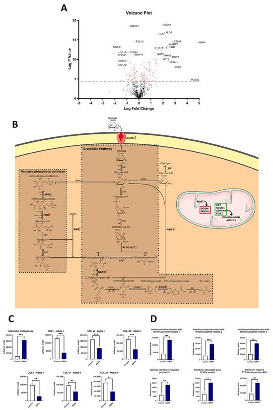 (A) Volcano plot showing a general view of the proteomic analysis, red dots represent the proteins that are significantly regulated by the RBP4 treatment while black dots are the proteins that are not significantly different. (B) RBP4 stimulation enhances glucose uptake through the GLUT1 receptor and produces a general upregulation of the glycolytic pathways, including ALDO A, ALDO C, TPI, GAPDH, and ENO1, which were enriched in RBP4-treated cells. In the pentose phosphate pathway, there was an enrichment of 6PGL and a depletion of PGD. Two proteins highly related to the previous pathways are PGM2 and AKR1. PGM2 generates more glucose 6-P in the glycolytic process, and AKR1 can produce more aldoses or more alcohol-enriched sugars that might increase the oxidative stress in the cell. (C) Graphic representation of the different collagen-related proteins that are significantly changed between control and RBP4-treated chondrocytes in the proteomic analysis. (D) All the interferon-related proteins are highly upregulated. RBP4 (retinol binding protein 4), GLUT1 (glucose transporter 1), ALDO A (fructose-bisphosphate aldolase A), ALDO C (fructose-bisphosphate aldolase C), TPI (triosephosphate isomerase), GAPDH (glyceraldehyde 3-phosphate dehydrogenase), 6-phosphogluconolactonase (6PGL), ENO1 (enolase 1), PGD (6-phosphogluconate dehydrogenase), PGM2 (glucose 1, 6-bisphosphate synthase), AKR (aldo-keto reductase). (Green arrows represent downregulated proteins; Red arrows represent upregulated proteins. ** p < 0.01; *** p < 0.001).