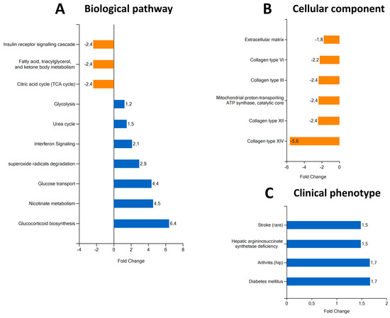 Employing the data obtained from the proteomic analysis about the modulated expression of diverse proteins, we performed different types of enrichment analyses. Biological pathway enrichment showed the upregulation of glucose transport and metabolism and the downregulation of insulin receptor signalling and citric acid cycle (Figure 5A). In the cellular component enrichment, we observed that extracellular matrix proteins, including several collagens (types I, III, VI, XII, and XIV), were reduced (Figure 5B). The clinical phenotype enrichment showed that the proteomic profile of the RBP4-treated hOACs exhibited significant similarities with arthritis and diabetes mellitus clinical proteomic profiles (Figure 5C).