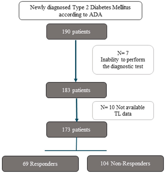 We included in our study, entitled the CORDIOPREV-DIRECT study, patients who were diagnosed with type 2 diabetes at the beginning of the study according to the American Diabetes Association (ADA) diagnosis criteria (fasting glucose ≥ 126 mg/dL, 2 h glucose during an oral glucose tolerance test (OGTT) ≥ 200 mg/dL, or HbA1c ≥ 6.5% (48 mmol/mol)) [20], and had not been receiving glucose-lowering treatment (190 out of 1002 patients). Following the study design, these measurements were taken at least six months after a clinical event related to CHD. Of these 190 patients, 7 were excluded because of their inability to perform the diagnostic test. Finally, a total of 183 type 2 diabetes patients were evaluated in our sub-study, of whom 73 patients reverted from type 2 diabetes during the 5 years of dietary intervention without the use of diabetes medication (Responders), while 110 did not achieve diabetes remission by the end of the follow-up period (Non-Responders). For the specific aim of this work, data on TL was available for 69 Responders and 104 Non-Responders (Figure 1).